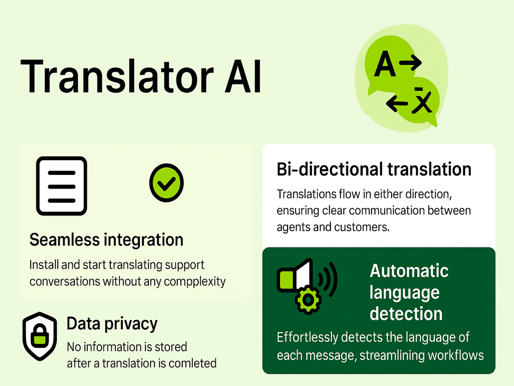 Translator AI is a simple yet powerful Zendesk app that streamlines multilingual customer support. It automatically detects languages and translates either outgoing agent replies or incoming customer messages, ensuring clear communication without switching tools.