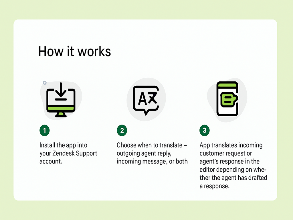 Translator AI is designed for speed, simplicity, and reliability. It integrates seamlessly into Zendesk so agents can communicate across languages without disrupting their workflow. Whether you're replying to a customer in another country or reading a message in an unfamiliar language, Translator AI handles the translation instantly.