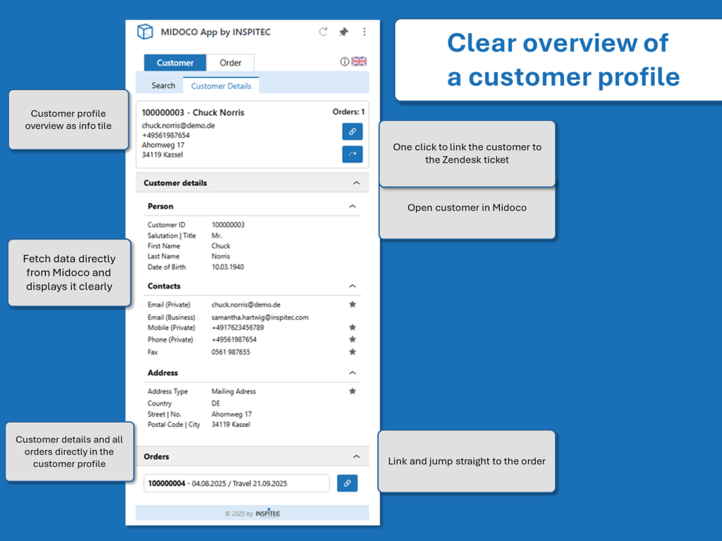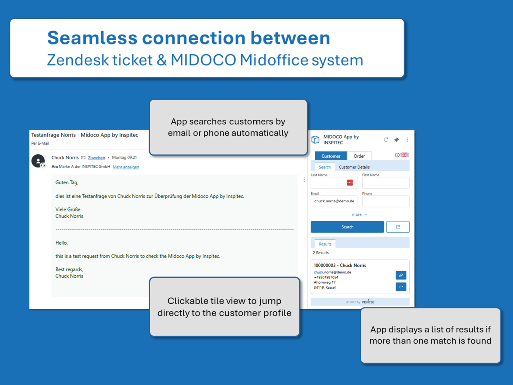 The app integrates directly into Zendesk and automatically provides all relevant customer and booking data from MIDOCO when opening or creating a ticket – no system switch or manual data search required.
