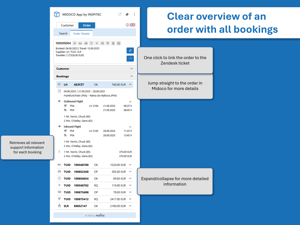 Whether via email, phone, or chat – based on the contact information in the ticket (e.g., email address or phone number), a live search is performed in MIDOCO.The result: a clear overview of the customer profile, all bookings, and all associated travel orders – with detailed information on bookings such as package tours, flights, hotels, insurance, car rentals, and more.Tickets can be linked or unlinked to a customer or booking at the click of a button, including a direct jump into MIDOCO for detailed processing.This creates a continuous information flow between the Zendesk ticket and MIDOCO – fully GDPR-compliant and without duplicate data storage.