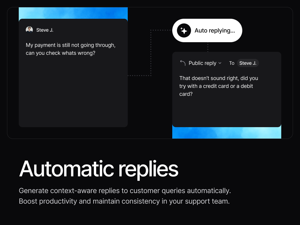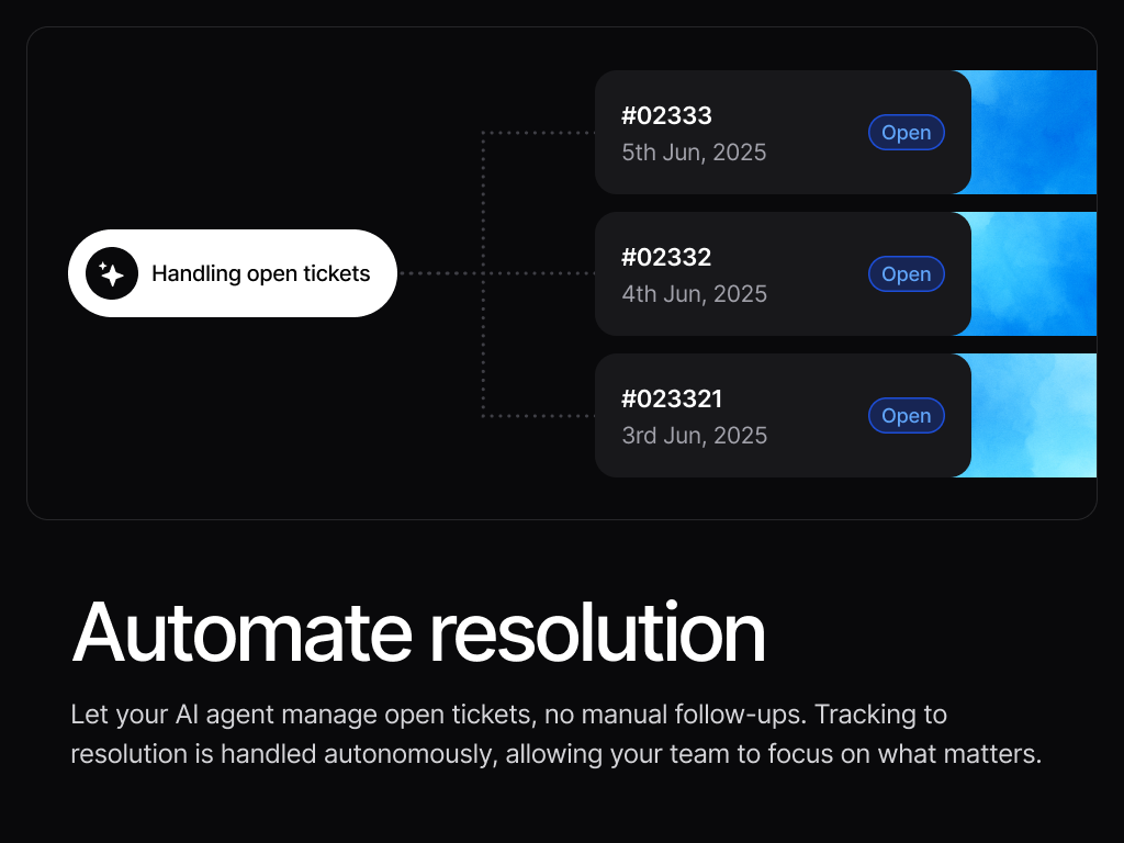 Integrate the agent with tools like Zendesk (including Zendesk Sunshine), Slack, Stripe, Calendly, Notion, Make, Zapier, and more. The AI can take actions such as updating customer subscriptions or booking appointments—and escalate to a human agent when needed.