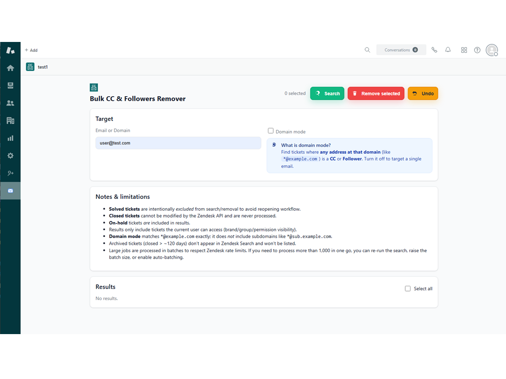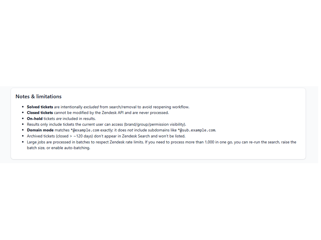 - How data is processed: All API calls are made via the Zendesk Apps Framework (ZAF) from the agent’s browser session. Data is used only in-session to render search results and apply removals.