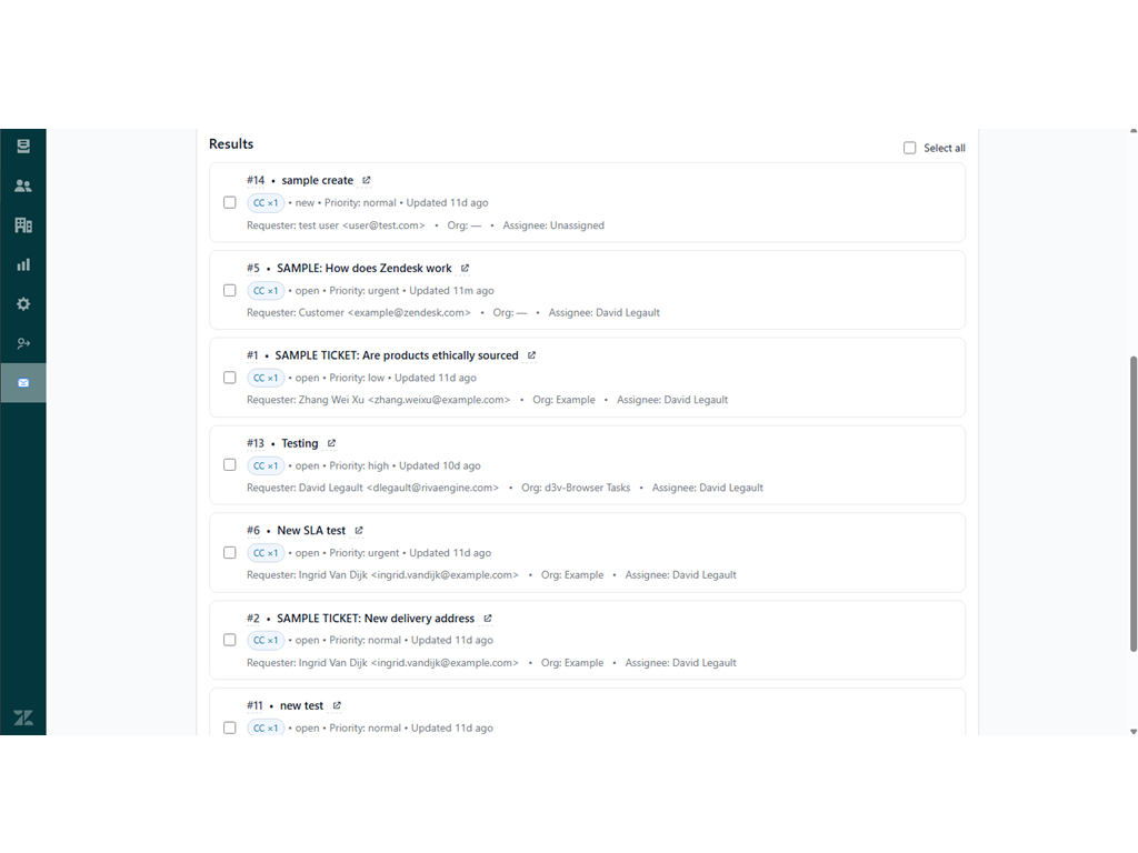 4) Review results — you’ll see ticket subject, requester, org, assignee, and status.