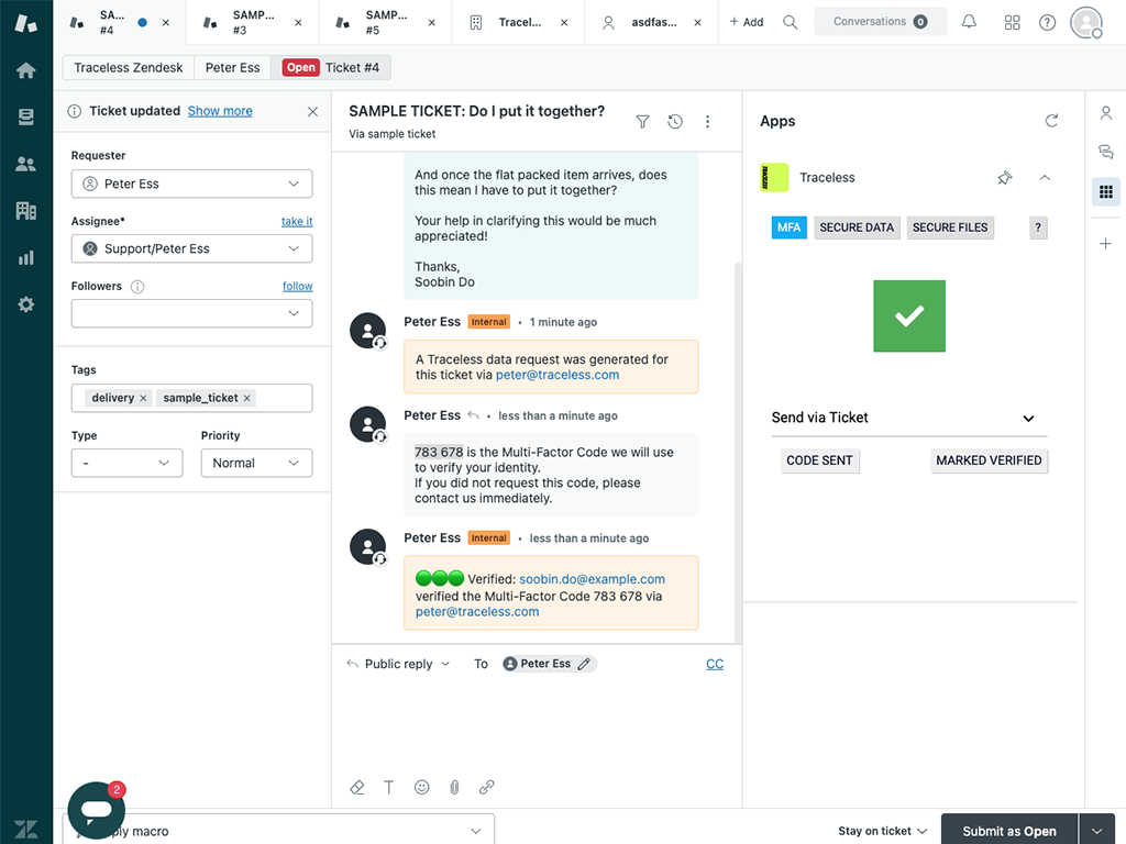 This integration is purpose-built for Zendesk teams, providing modern, easy-to-use tools to protect sensitive customer communications. Instead of relying only on email addresses or ticket metadata to confirm identity, Traceless layers in biometric multi-factor authentication (MFA) and expiring, one-time links that work seamlessly inside Zendesk workflows.