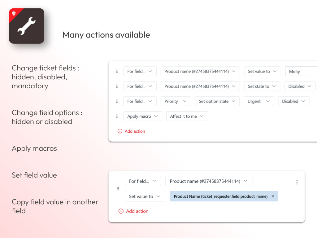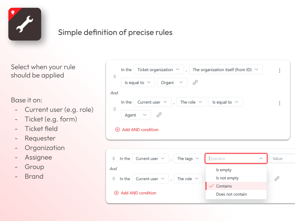 Define simple rules to manage your agent ticket forms and fields. Reduce confusion and enforce business-specific behaviors in your tickets.
