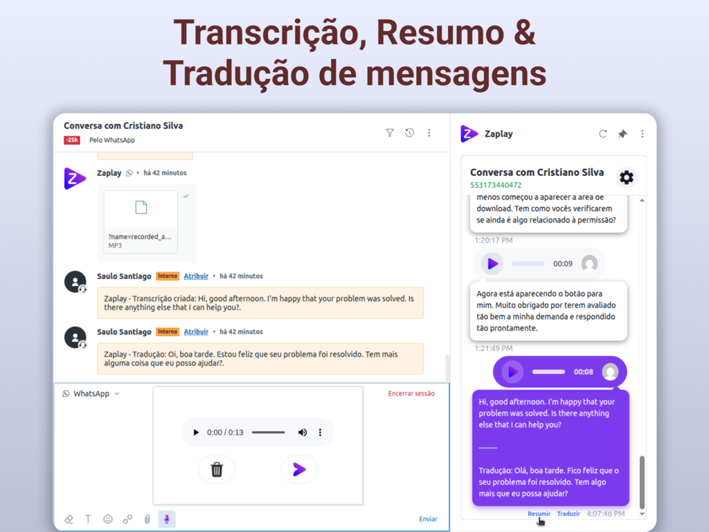 Zaplay integrates WhatsApp Business with Zendesk to record, play, and transcribe voice messages with AI. It also creates conversation summaries, enables internal notes, and provides reports to boost productivity, speed, and quality.