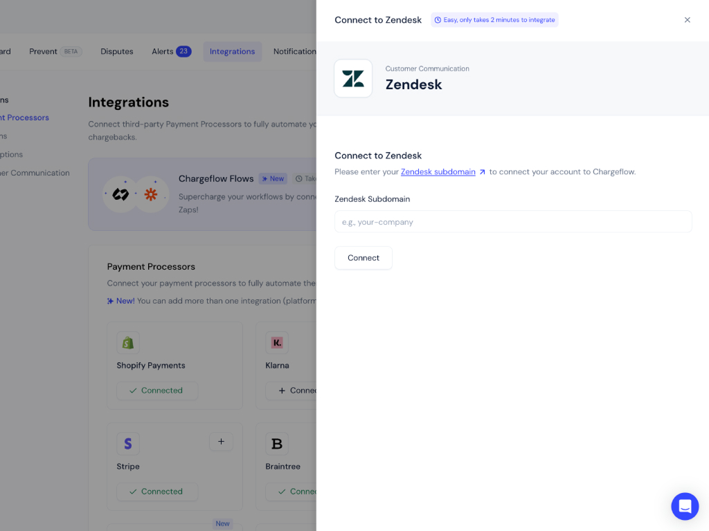 - Open Connect Chargeflow and Zendesk: http://app.chargeflow.io/integrations?integration=zendesk.