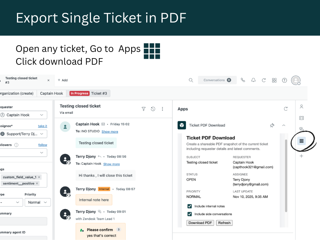 Open any ticket; the app appears in the sidebar as “Ticket PDF Download”.