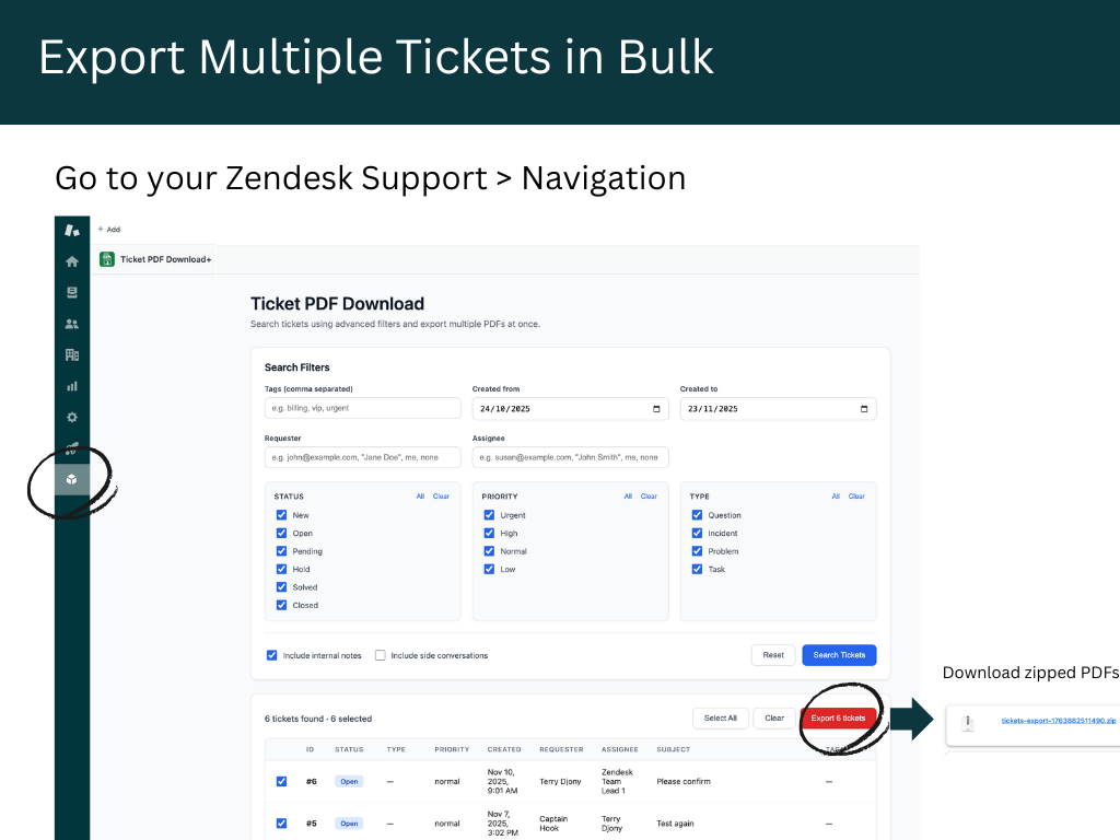 Ticket PDF Download lets agents export clean, shareable PDF snapshots of tickets—either individually from the ticket sidebar or in bulk using advanced search filters. PDFs can include ticket metadata, requester/assignee details, public comments, internal notes, and Side Conversations.
