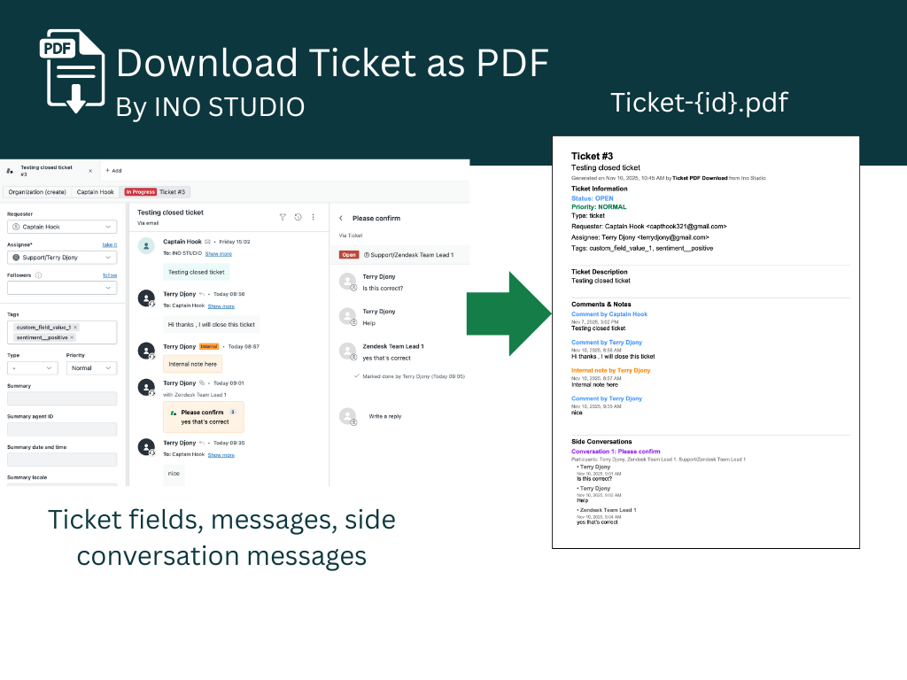 Ticket PDF Download lets agents export a clean, shareable PDF snapshot of any ticket directly from the ticket sidebar. The PDF can include ticket metadata, requester/assignee details, public comments, internal notes, and Side Conversations.