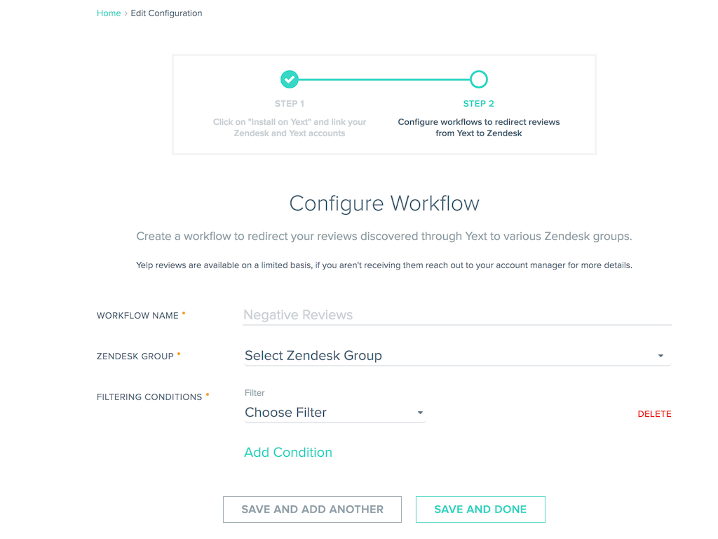 Once your authorize the app to access both your Yext and Zendesk accounts, you will be taken to a Workflow configuration page to set up Review Workflows, so you can control which reviews detected in Yext get sent to Zendesk.