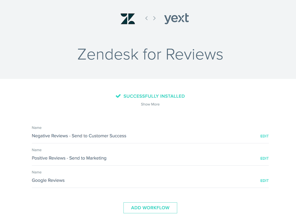 With the Yext Reviews for Zendesk app, you can allow your customer service team to manage the reviews across the Yext Knowledge network directly in Zendesk. If you’re already using Yext Reviews to actively monitor your online reviews, you can see when customers express praise or criticism publicly via the reviews they leave on your website and sites across the Yext Knowledge Network. Install the Yext Reviews for Zendesk App, and create workflows in order to generate a support ticket based on the criteria in the review.
