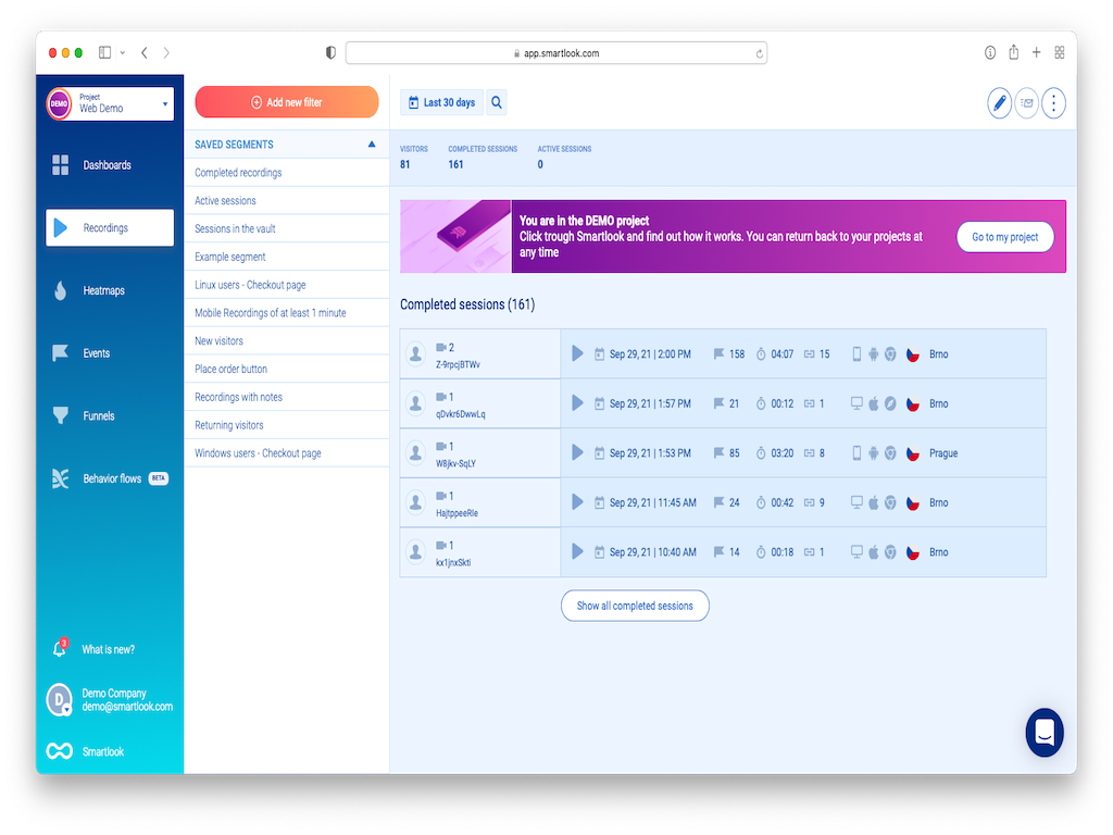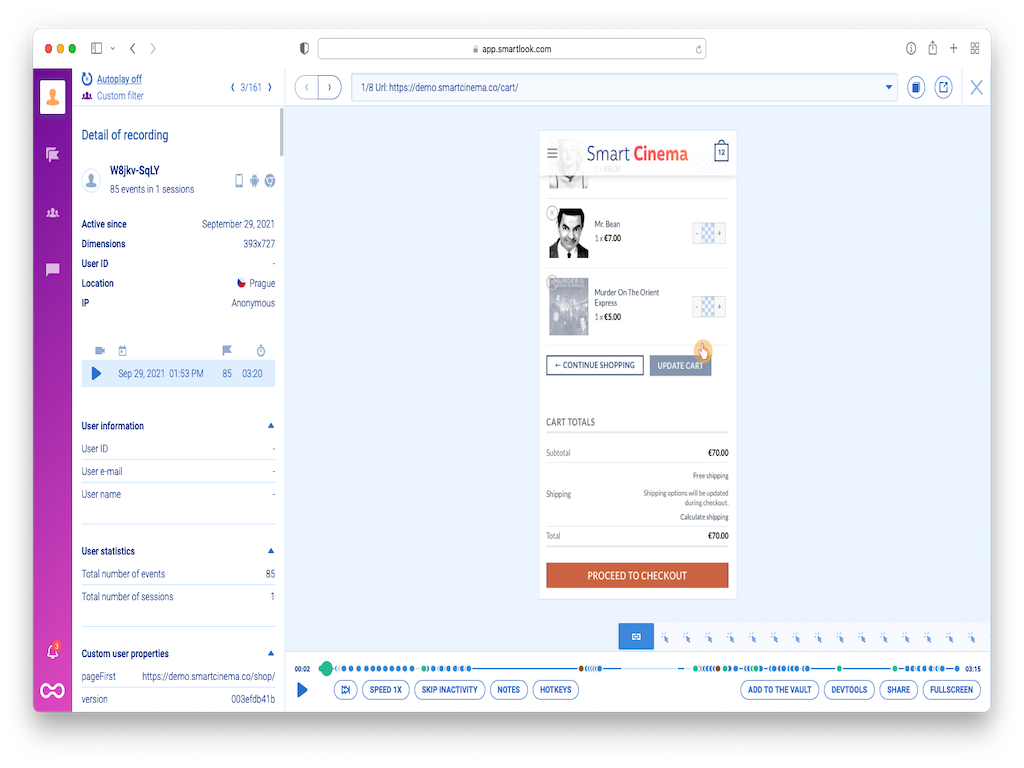 Smartlook allows you to understand behavior of your customers by recording a video of each visitor on your website. In the video you see visitor’s mouse movement, clicks and pages he browsed.