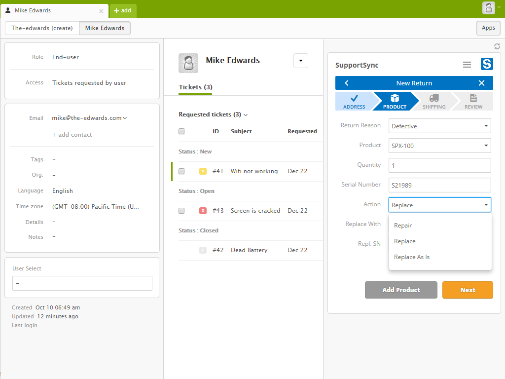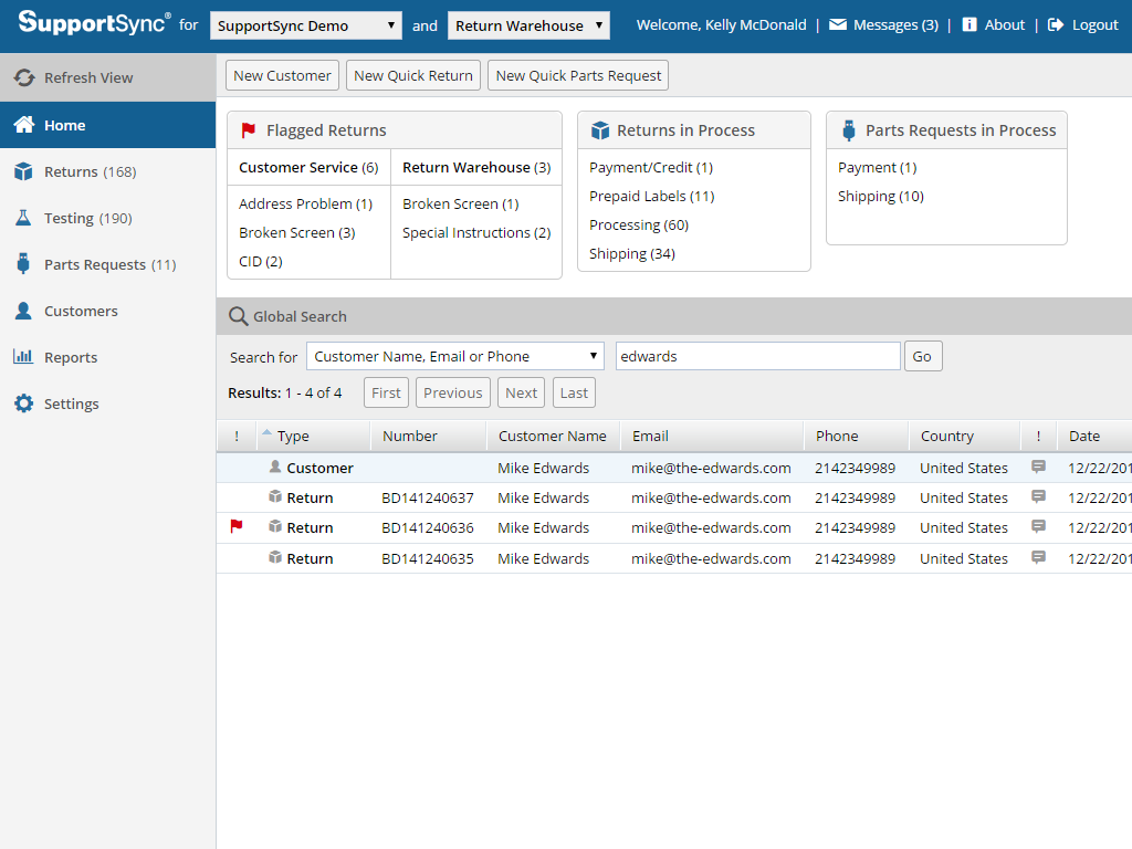 SupportSync helps customer service agents quickly create, view and track product returns (RMA's) and create prepaid shipping labels while providing return centers with powerful processing tools and features.