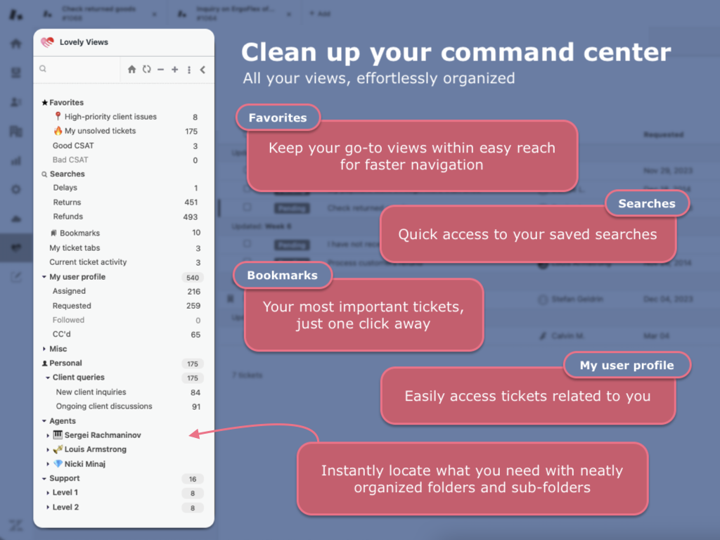 Lovely Views reimagines ticket navigation, organization, and management on Zendesk. With a focus on efficiency and user experience, we've designed an app that not only simplifies ticket handling but also enriches it with advanced customization options, ensuring your team can focus on what truly matters — providing exceptional support.