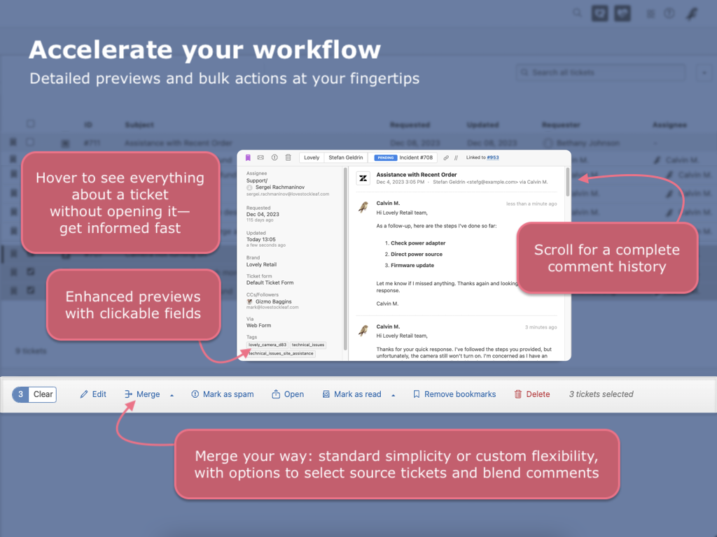 More bulk actions that let you manage multiple tickets in a snap—mark as read/unread, bookmark/remove bookmark, standard/custom merge