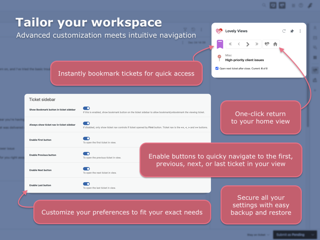 Designed with the goal of enhancing Zendesk's core capabilities while keeping it clean and user-friendly, Lovely Views is about giving you control. We've integrated feedback from real Zendesk users like you, ensuring every feature not only meets but beats your expectations.