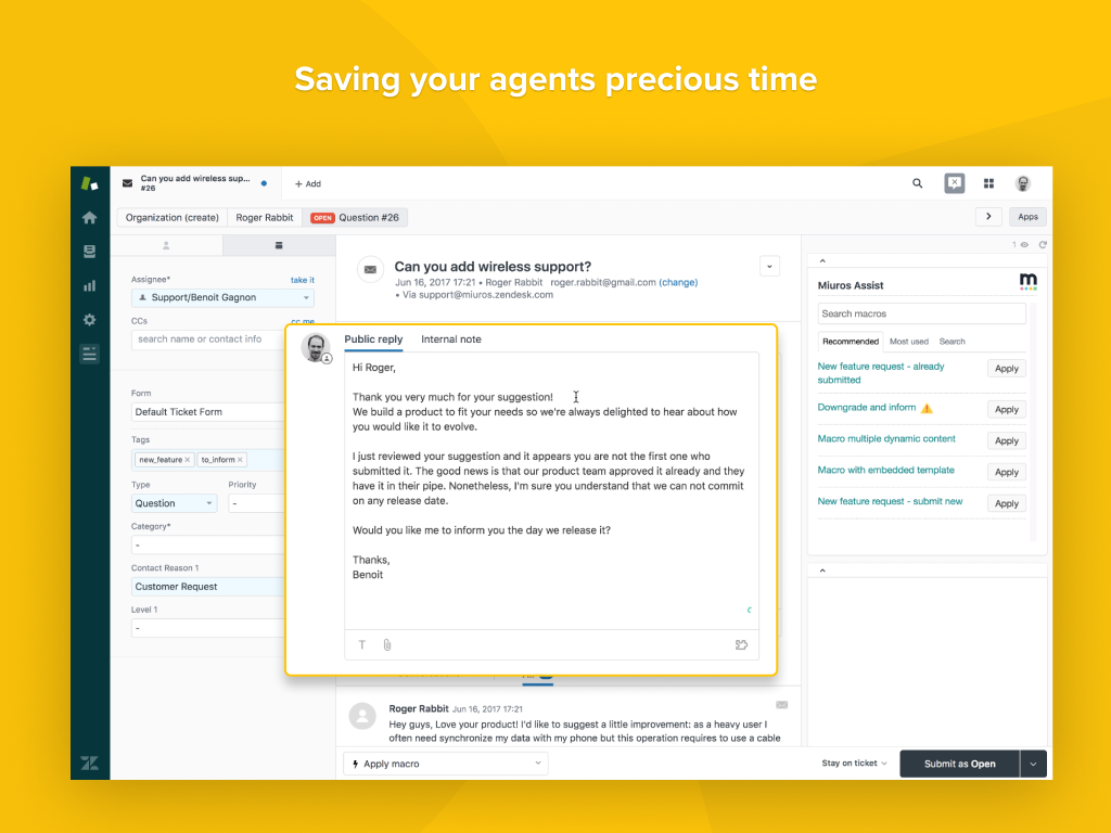 We use Natural Language Processing to scan the content of each ticket and recommend the macros that best match each specific request.Can’t find the right macro in the list of recommendations? Assist learns from your actions and improves recommendations over time.