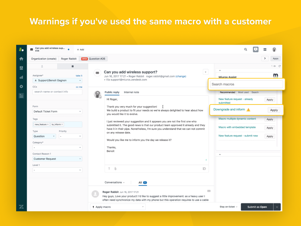 • You’ll get a warning sign if a specific macro has already been used with a customer in any of his/her previous tickets.