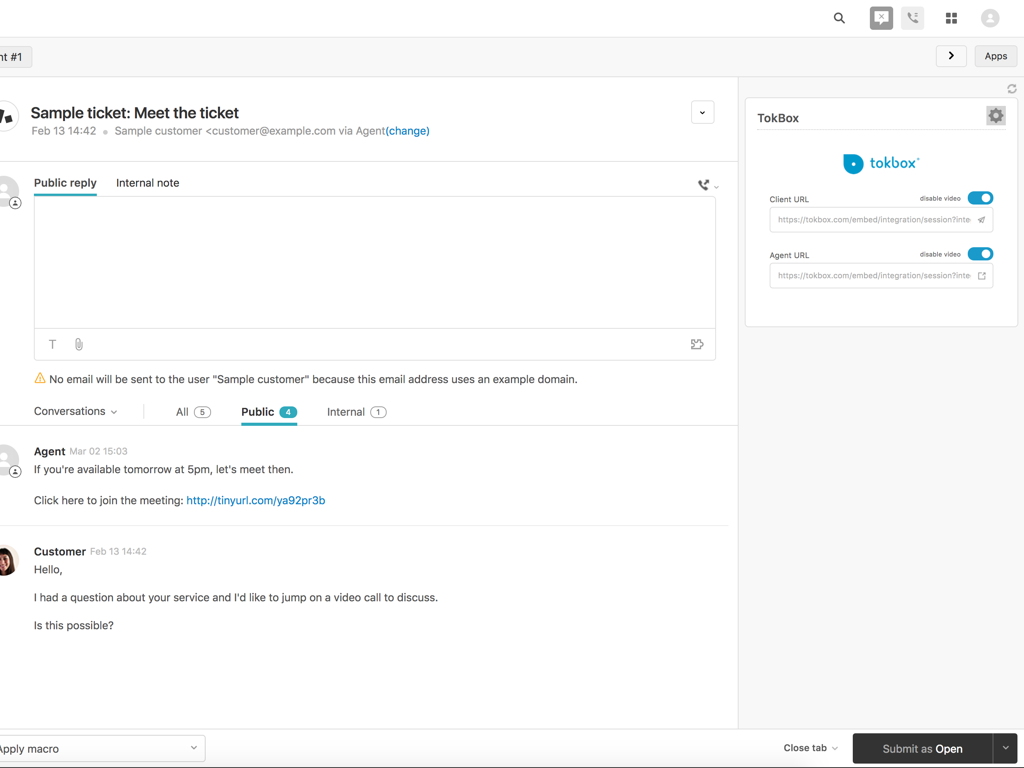 The TokBox integration for Zendesk allows agents to share a link to a live video and/or audio meeting, without leaving the Zendesk platform.