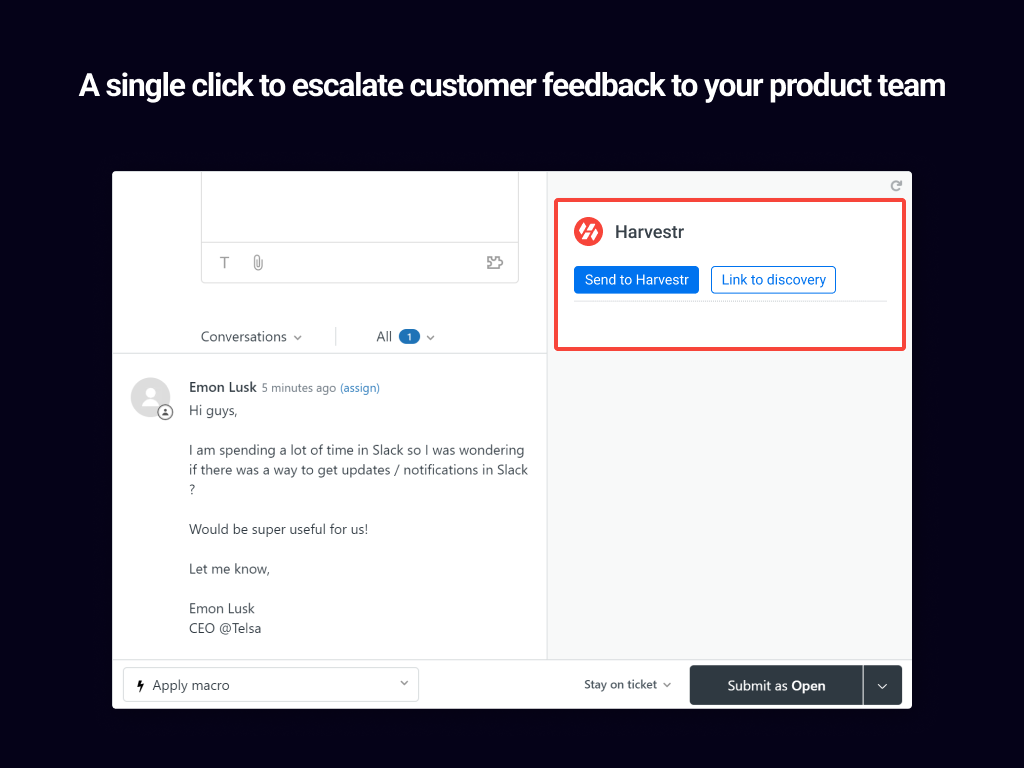 With this integration, agents can escalate Zendesk tickets that contain valuable customer feedback to Harvestr, with a simple click. These tickets are then merged with all your other feedback channels (emails, CRM, Slack...), helping you identify the most important customer problems and the features you should focus on to improve your customer experience.