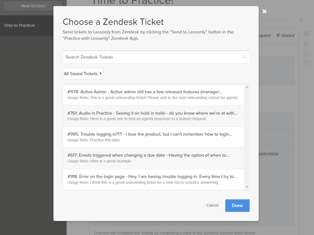 On each ticket, there will now be a Seismic Learning Practice section on the right hand apps side bar. This feature can be used to send tickets from Zendesk to Seismic Learning. Add a usage note below to explain why this ticket would be helpful to add to a lesson for Practice.