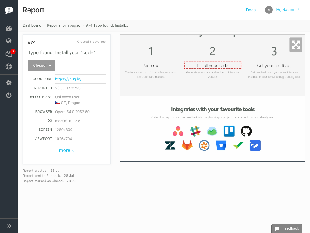 Collect visual feedback, suggestions and bug reports from your team or clients as tickets for your Zendesk support team. Ybug will automatically attach screenshot and some important information about the browser environment.