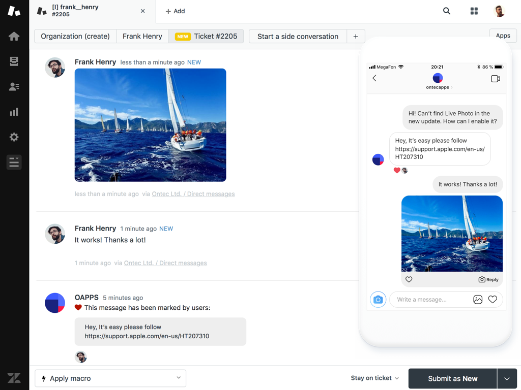 Engage with your Instagram users via Zendesk Support. Reply to all direct messages. Unleash the full Zendesk power - use macros, triggers, and ticket assignments the same way you used to work with e-mails.