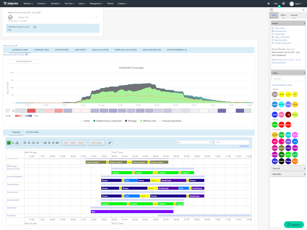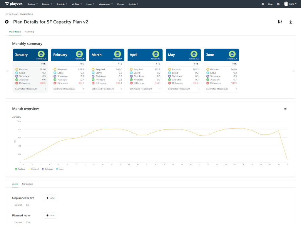 Playvox WFM moves at the speed of your business, elevating capacity planning from a one-and-done silo to an integrated and dynamic solution that evolves with changing hiring conditions. With Playvox WFM, there is no need to upload information manually. Instead, the solution pulls historical volumes from the system. The information is color coded for easy interpretation, allowing you to see the results for differing scenarios. You also have the ability to easily share the plan with different collaborators, which offers the ability to create differing scenarios to better prepare for the future.