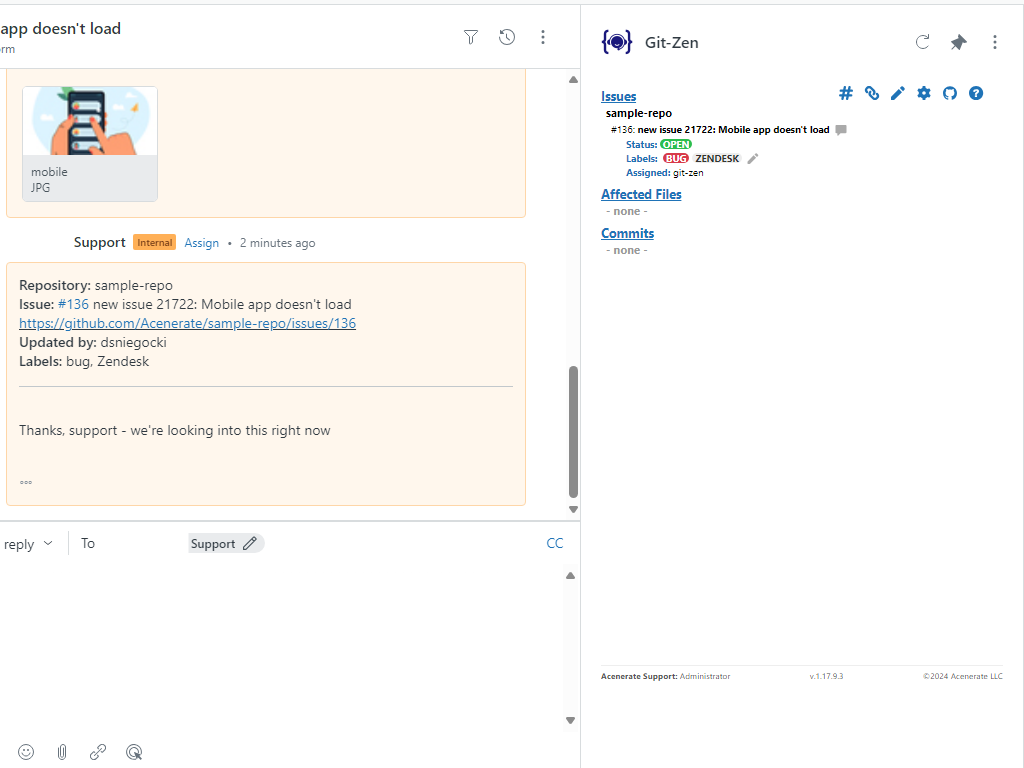 Add comments to issues from Zendesk, and display relevant commit details (who changed what, and why). This ensures a smooth flow of information between support agents and developers.