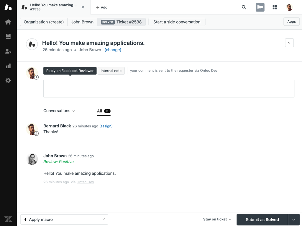Now all Reviews will be created in Zendesk. You can set up triggers and views to filter incoming reviews. Zendesk agents can reply to a page reviews - it works the same way as any other channel.