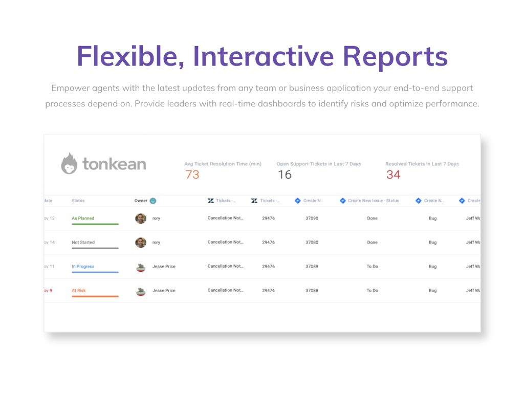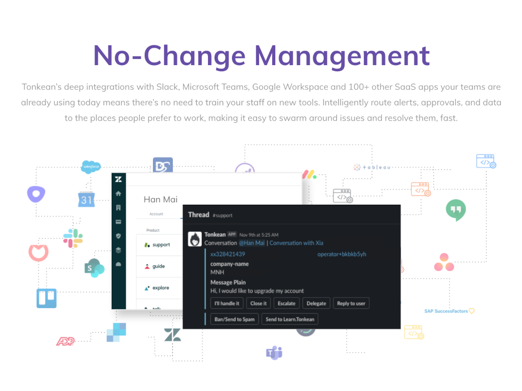 Via an advanced graphical workflow builder and 100+ integrations to packaged or custom applications, Tonkean enables Zendesk customers to rapidly build, deploy and optimize complex customer support journeys from end-to-end.