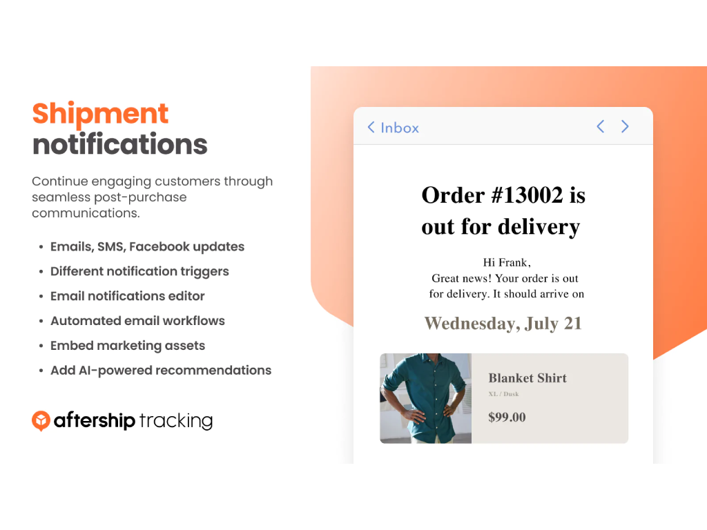 AfterShip is the no.1 tracking solution for top retailers to improve customers’ post-purchase experience. AfterShip’s branded tracking page allows brands to drive traffic back to their shopping site, and re-engage with customers with proactive delivery updates. Retailers can also monitor the shipping performance and find out any exceptions before customers notice.