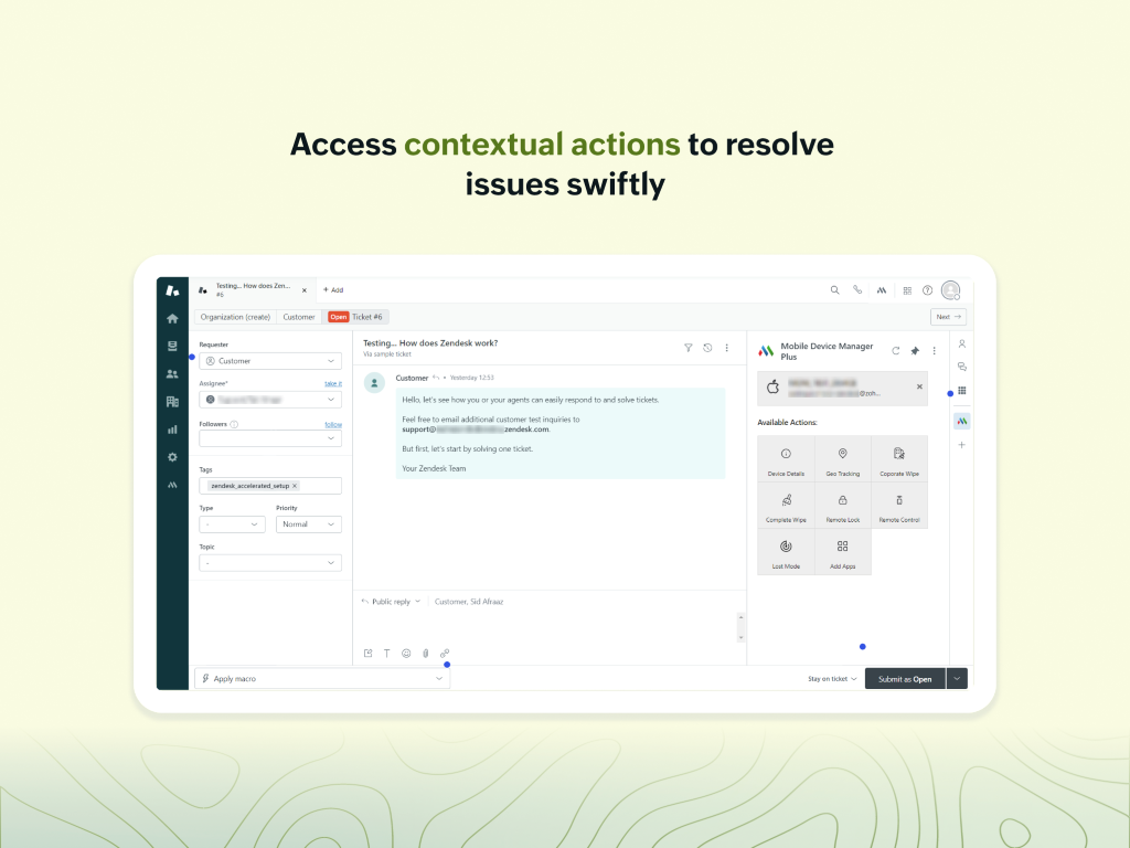 Mobile Device Manager Plus is an enterprise mobility management solution that automates the management of mobile devices with the extensive support for mobile device management (MDM), mobile content management (MCM), mobile app management (MAM). With the Zendesk integration, the help desk technicians can perform different management tasks right from the Zendesk console.