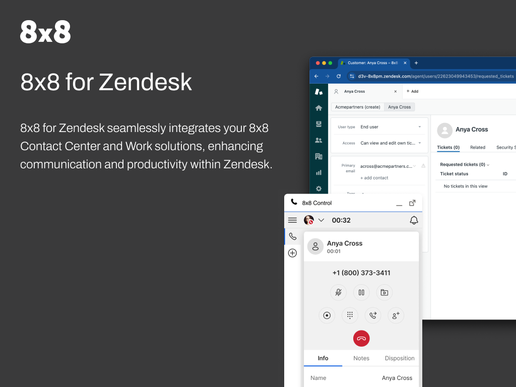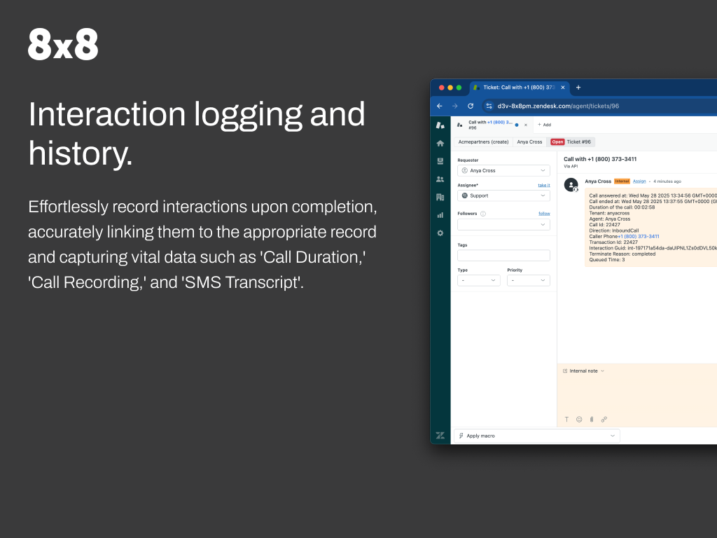 8x8 for Zendesk seamlessly integrates your 8x8 Contact Center and Work solutions, enhancing communication and productivity within Zendesk.