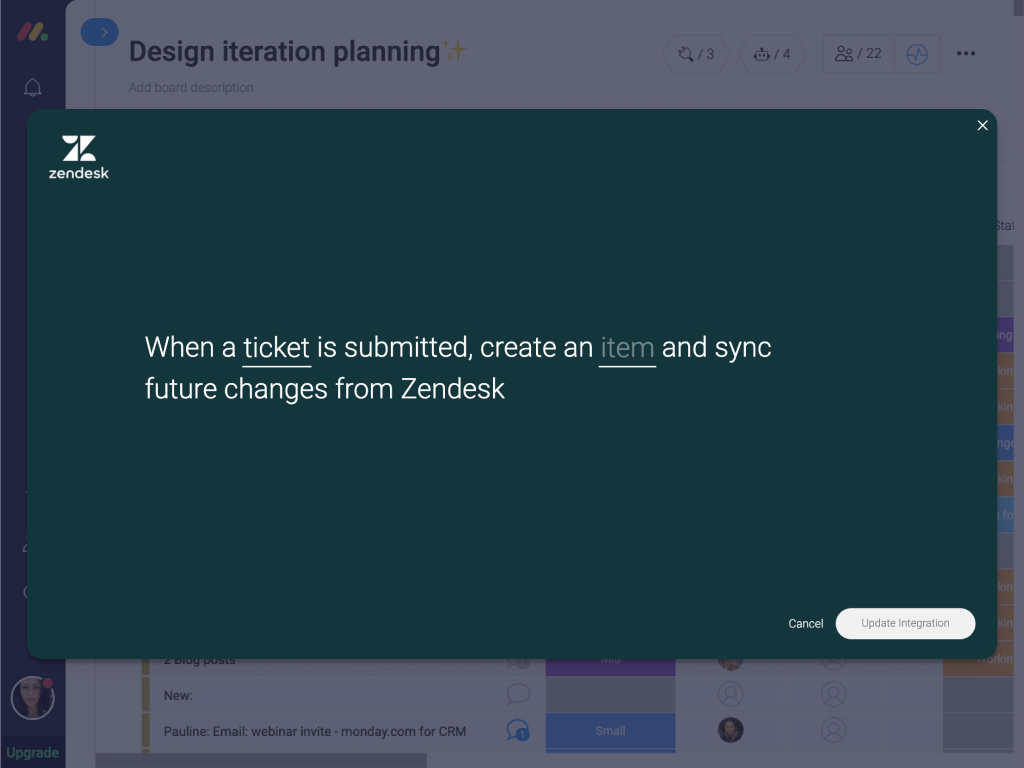 Using this integration, you can automatically transform Zendesk tickets into engineering tasks, keep track of progress from one place, notify team members on changes or delays and update your users directly from monday.com.