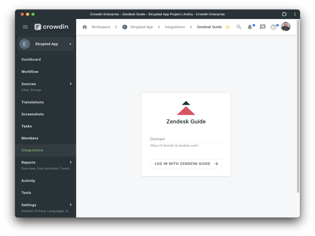 Open Project Settings, Integrations tab in Crowdin. Scroll down to the Zendesk Guide section.