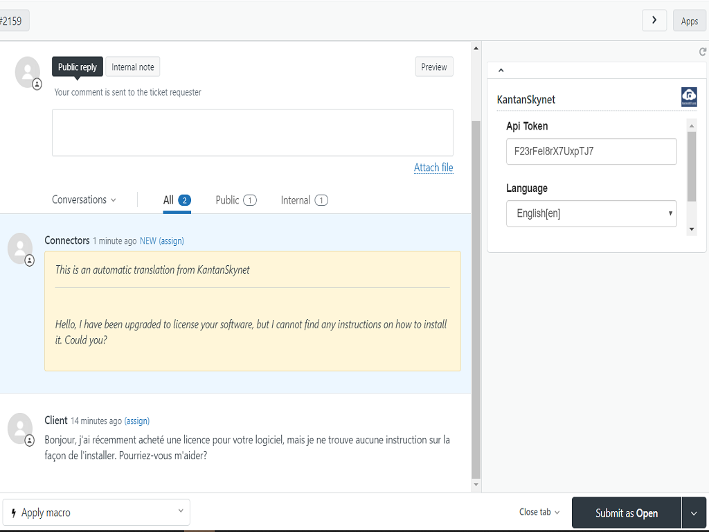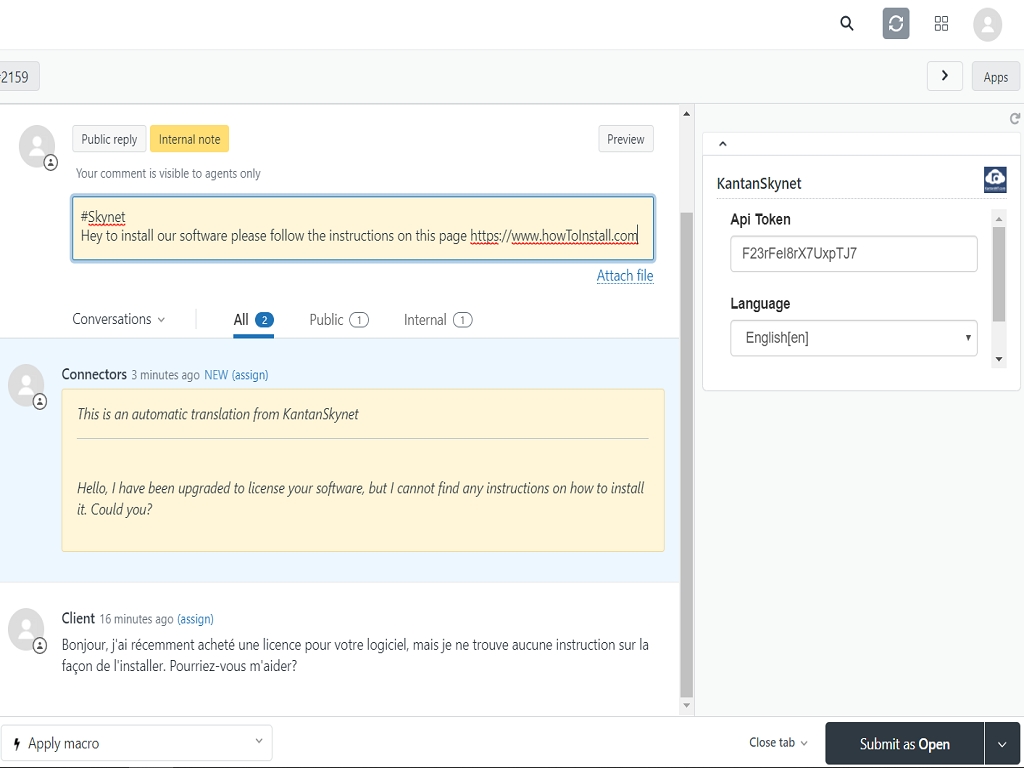 i). Open the ticket you want to respond to and select the response to be an Internal Noteii). In order to send your response to KantanStream, type #Skynet and on a new line, type your resonse.iii). Once you are done, hit the Submit button as you normally would submit a ticket response. The response has now been sent to KantanStream for translation.Translating client messages to your language:i). Click the Translate Client Messages button in KantanStream app on the ticket side-bar. The client messages will been sent to the KantanStream platform for translation and the ticket conversation will be updated once it is done.
