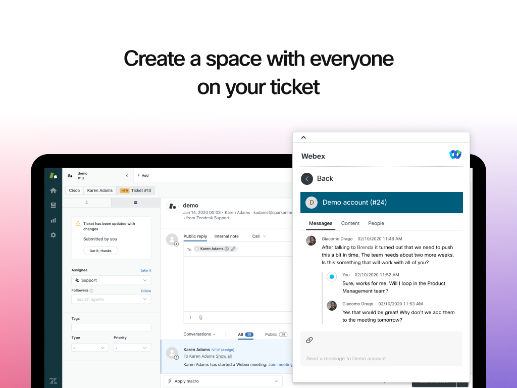 Easily gather the right folks into the conversation with a Webex space. If you need to break into separate discussions, you can instantly create, link, and unlink spaces in your Zendesk ticket.
