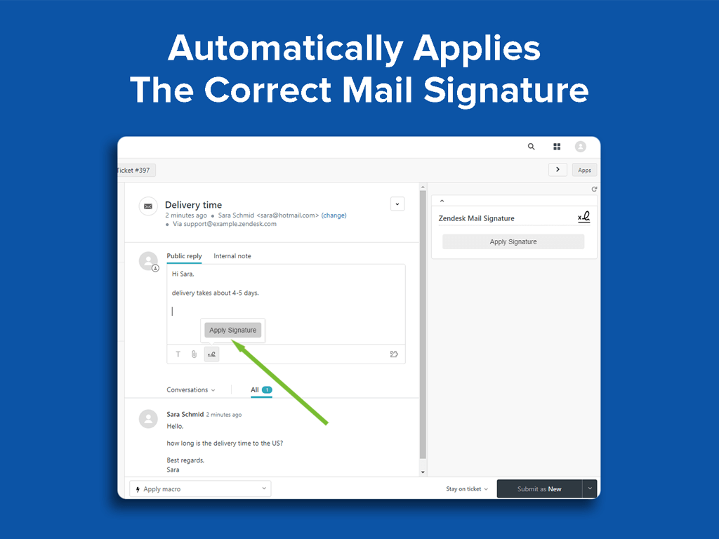 Don't waste your time with applying the correct email signature! No matter how many signatures you have - Mail Signature for Zendesk Support allows you to automatically apply the correct mail signature with just 1 click!