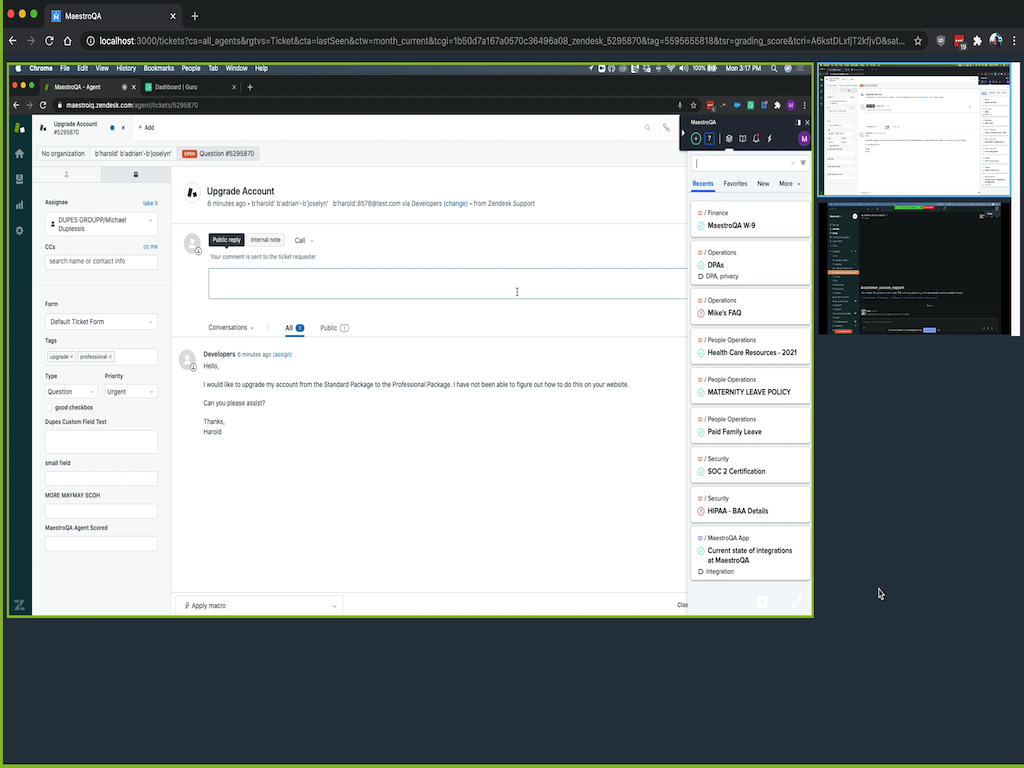 To get started on experiencing our Screen Capture/Screen Recording feature and/or our full Quality Assurance (QA) / Quality Management (QM) platform to empower your agents by grading their support interactions via our QA scorecards and providing personalized coaching feedback via agent coaching , contact our team to discuss the best Maestro QA package for your QA / QM needs.