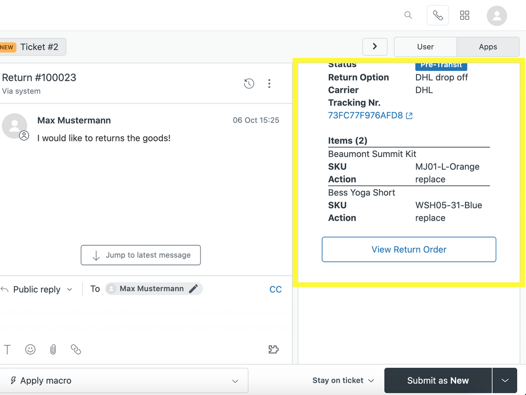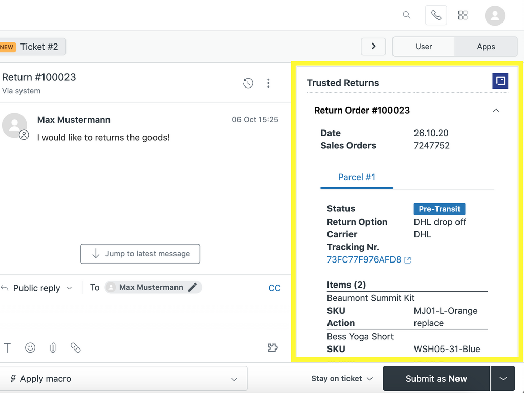 Trusted Returns Zendesk integration helps your customer support team be more productive by showing the corresponding Return Order data - Sales Order number, chosen Return Option, list of Items to be returned, tracking numbers etc.