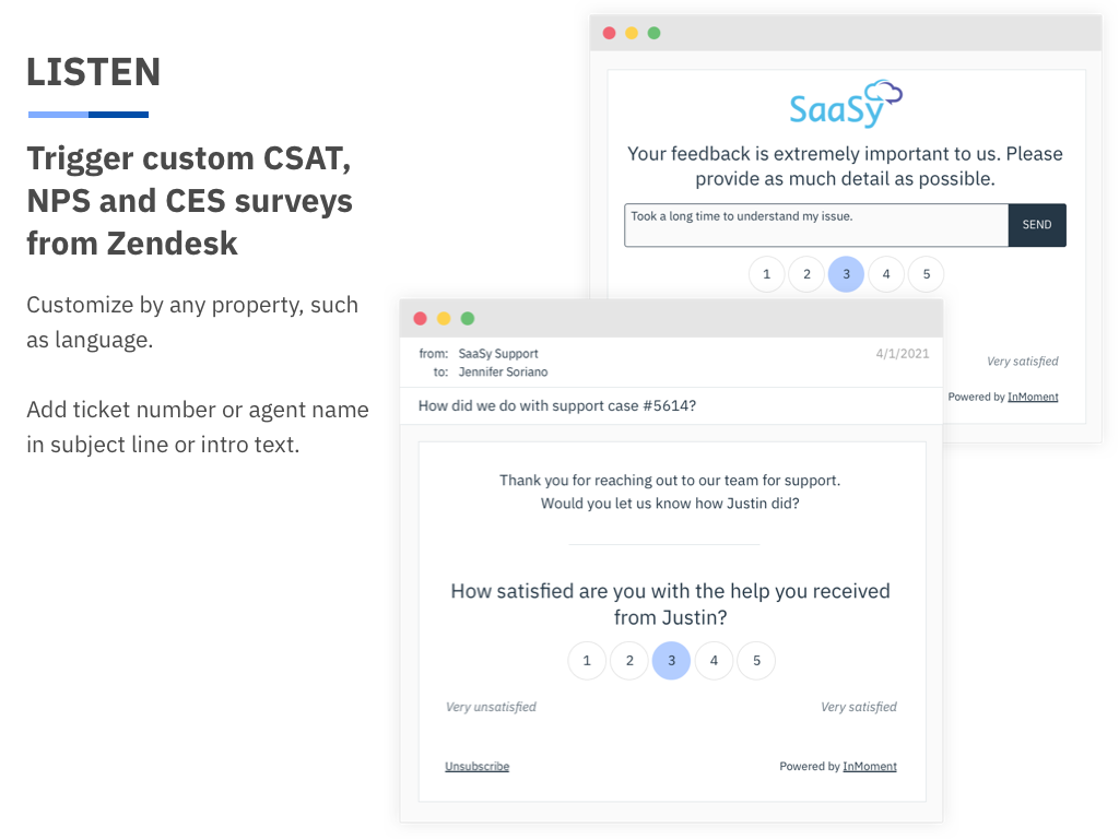 CSAT responses flow back to the ticket record, so you can follow up with the customer or trigger other action from within Zendesk