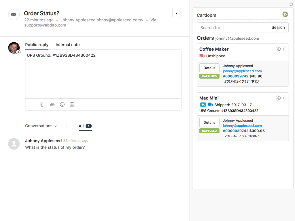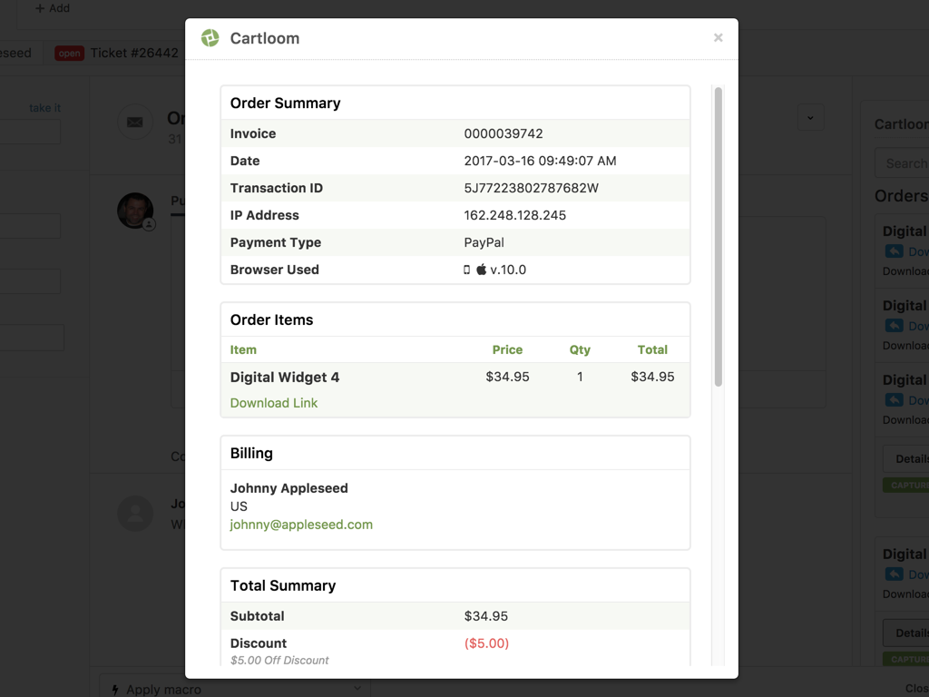 Need to verify a support client's order history, serial number or eligibility for support and upgrades? The Cartloom app for Zendesk pulls in detailed order information from your Cartloom.com ecommerce account. View purchase history right next to your support tickets. Allow your agents to efficiently respond to order related queries by placing order info right into Zendesk!
