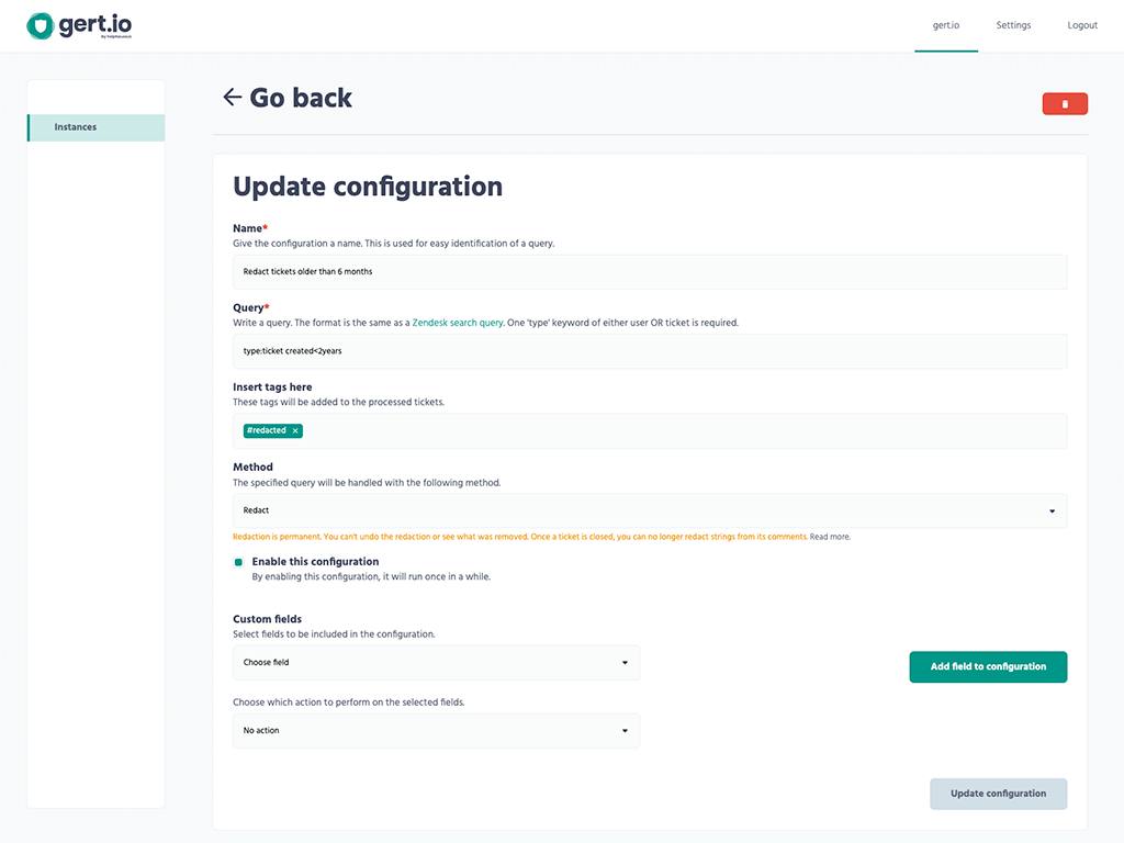 Once your Zendesk is added to gert.io you can easily add your company’s data-retention policies and define your criteria for what, when and how often ticket data should be redacted. After this, gert.io automatically redacts sensitive customer data from your Zendesk without deleting important statistics. Meaning you will be completely compliant whilst retaining relevant knowledge about your customers' actions, which you can use to further develop your services.
