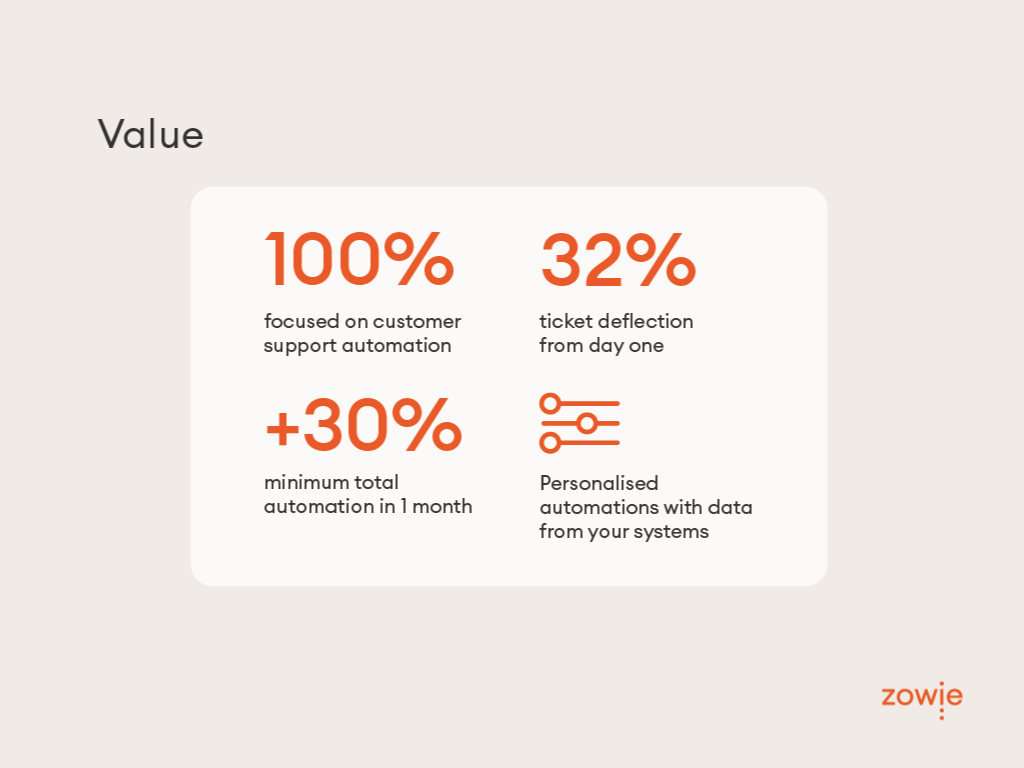 Zowie automates 32% of inquiries in 24 hours and 60%+ in a few weeks. Up your customer service game and become more efficient now, not in six months.