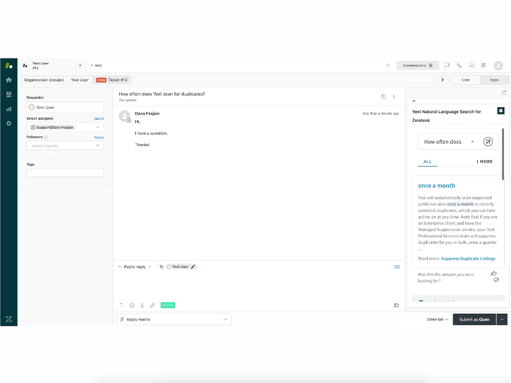 The Yext Search app is free to Yext and Zendesk customers. If you don’t have a Yext account, sign up for a free trial here and get started building your Answers experience!