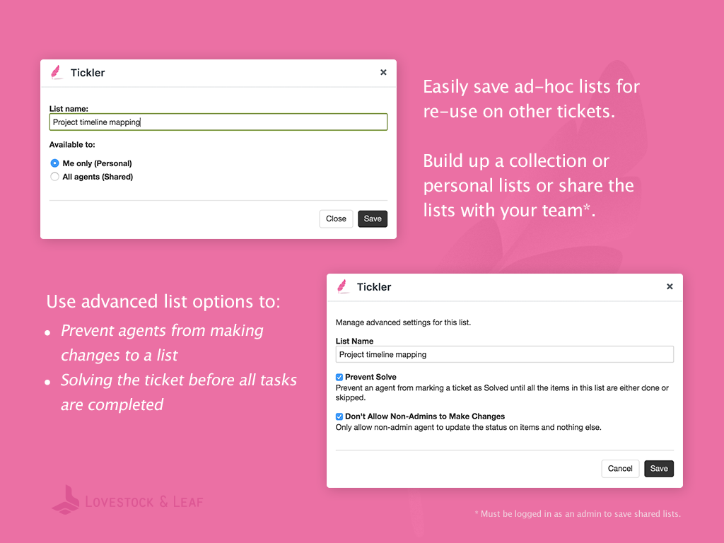 Allows your agents to create and manage checklists within tickets. This is the free version of the Tickler app. If you require more features, please see our paid version: Tickler.
