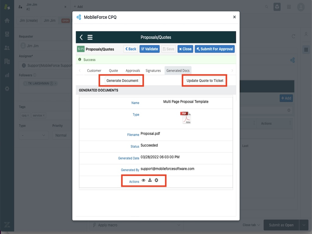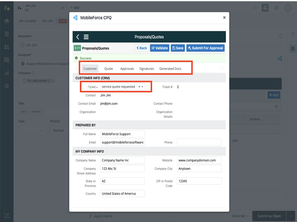 3. In Zendesk Support, access the MobileForce CPQ application from any Ticket record.