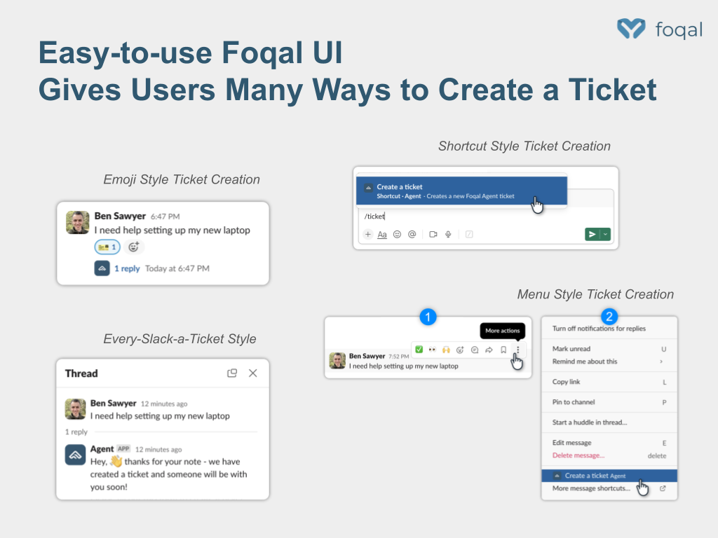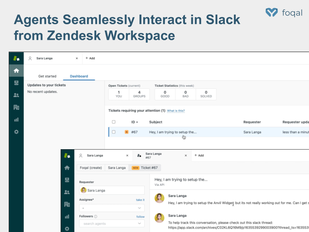 Whether it's for Customer Support, or IT/HR help desk, Foqal provides native service operations in Slack and Microsoft Teams to streamline agent work while improving CX. Foqal provides conversational ticketing, workflows, automations and reporting analytics that seamlessly integrate with Zendesk for an end-to-end experience that your users will love.